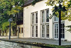 Ein Blick von der westlich gelegenen Wiese zeigt das Gebäude vor allem im warmen Licht der Abendsonne von seiner ganzen stolzen Ausdruckskraft. Im Norden fügten die Amerikaner schon 1952 eine Erweiterung in Form eines Ball-, Speise- und Theatersaales samt Großküche hinzu, der sich architektonisch unauffällig und homogen an die historische Bausubstanz anbindet. So nutzten die Amerikaner weiterhin den Komplex für repräsentative Empfänge und Veranstaltungen unter Militärs oder auch mit Zivilisten aus der deutschen Politik und Gesellschaft.