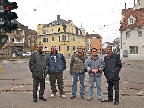 In front of the former “Last Chance” in Pfersee: Josef Klein, Jürgen Centner (AIA), Greg Nygaard, Roy Bowen, Georg Feuerer (AIA) (from left).