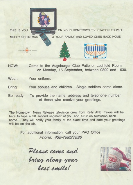 These Christmas actions with up to 100 accommodations per year went on until 1991, but still it was not always possible to accommodate each and every soldier. The Public Affairs Office executed the extremely lavish organization of those Christmas accommodations. In contrast to most other garrisons, Augsburg soldiers were introduced to their selected guest families beforehand at the Sheridan Officers Club. Requests and interests, but also possible dislikes of both parties, were taken into consideration a far as possible. Here also, long-term friendships developed between the involved parties.