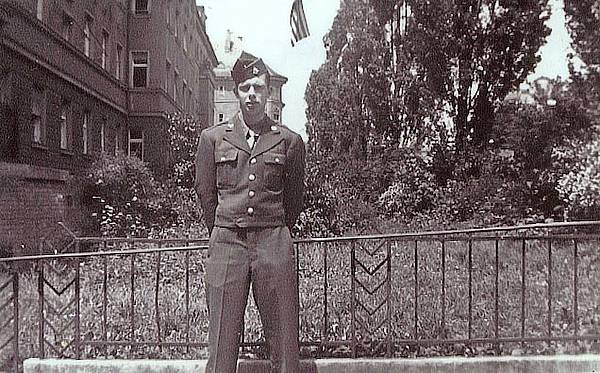 The vast building complex at Haunstetter Straße, near Rotes Tor, was confiscated by the 9th Infantry Division in 1946. Soldier Clifford Briggs was then billeted there. The big Stars and Stripes flag indicates the occupation of the object, thus being American territory. In 1948, the building was also used to house German entertainers for the U.S. Army. (Photo: Clifford Briggs).
