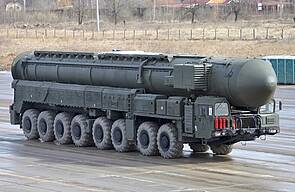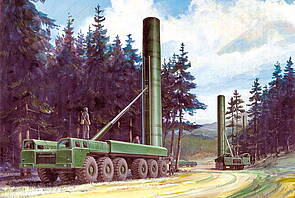 Machtdemonstration mit großen Kalibern. Die Raketen befanden sich in den Schutzhüllen auf den gigantischen Fahrzeugen und wurden alle Jahre bei den Mai-Paraden auf dem Roten Platz gezeigt. Im Bild links eine Interkontinentalrakete TOPOL M1, rechts eine SS20. Die letzte dieser Mittelstreckenraketen wurde am 12. Mai 1991 vernichtet.